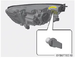 3. Nehmen Sie die Glühlampe aus der Fassung, indem Sie die Glühlampe nach unten drücken und gegen den Uhrzeigersinn drehen, bis ihre Rastnasen auf die Aussparungen in der Lampenfassung ausgerichtet sind. Ziehen Sie die Glühlampe aus der Fassung.