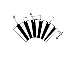 Einschnitttiefe (A) zwischen den Segmenten messen. Wenn keine Einschnitttiefe vorhanden ist (B), sondern berstand, Einschnitte mit einem geeigneten Sägeblatt auf die spezifizierte Tiefe nacharbeiten. Ablagerungen (C) aus allen Einschnitten entfernen. Die Einschnitte soll nicht rundlich und nicht zu schmal und auch nicht V-förmig (D) sein.