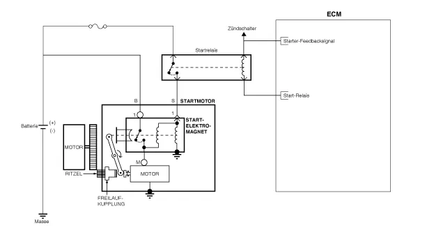 Wenn der Zündschalter in die Stellung 'START' gedreht wird, fließt elektrischer Strom und legt die Magnetspule des Anlassers an Spannung.