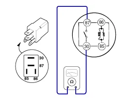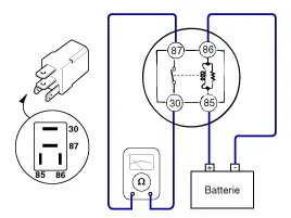 12 V an Klemme 85 und Masse an Klemme 86 anlegen und dann auf Durchgang zwischen den Klemmen prüfen (30 und 87).
