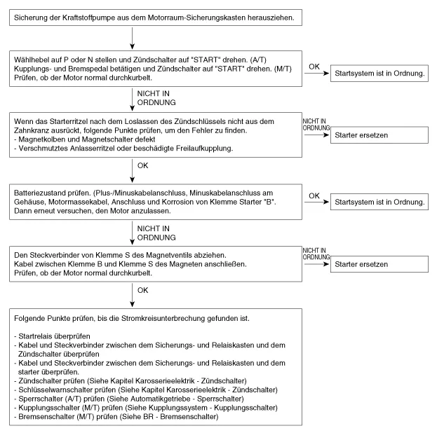 Das Startsystem besteht aus Batterie, Starter, Magnet-, Zünd- und Sperrschalter (A/T), Kupplungspedalschalter (M/T), Zündschlossschalter, Verbindungskabeln und Batteriekabel.