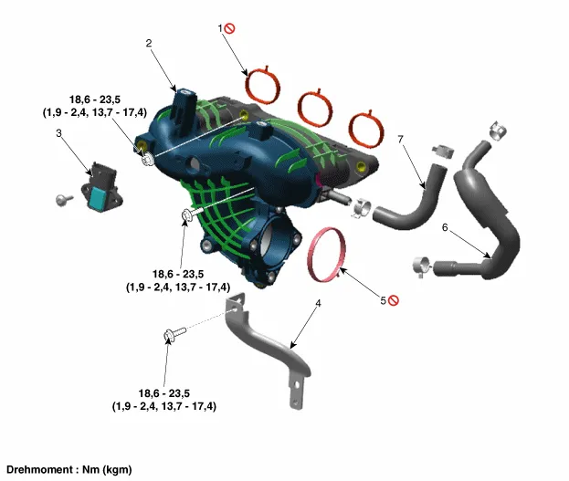 6. Unterdruckschlauch 7. Schlauch der Kurbelgehäuseentlüftung (PCV) |