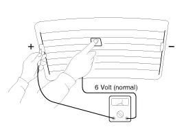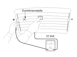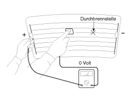 Heckscheibenheizungsschalter einschalten und mit einem Voltmeter die Spannung der einzelnen Heizleitungen im mittleren Bereich der Scheibe messen. Zeigt das Voltmeter 6 V an einem Leiter an, ist die Leitung zur Heckscheibe in gutem Zustand.