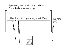 Zum Prüfen auf Stromkreisunterbrechungen, das Prüfkabel langsam in Richtung des Bereichs bewegen, in dem die Stromkreisunterbrechungen vermutet werden. Einen Punkt suchen, an die Spannung 0 V beträgt. Eine Unterbrechung ist an der Stelle, an der sich die Spannung ändert.