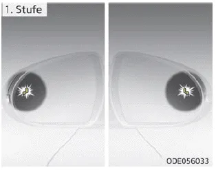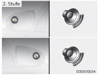 Wenn die zweite Alarmstufe aktiviert wird, blinkt eine Warnleuchte auf dem Außenspiegel und es ertönt ein Alarmsignal. Wenn Sie den Blinkerschalter in die ursprüngliche Position bewegen, wird die zweite Alarmstufe wieder deaktiviert.