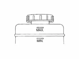 Bremsflüssigkeitsstand im Ausgleichsbehälter kontrollieren. Der Flüssigkeitsstand muss zwischen den Markierungen “MIN” und “MAX” an der Seite des Ausgleichsbehälters liegen.
