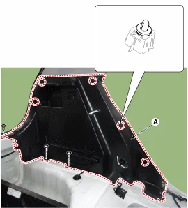 Befestigungsschrauben lösen, dann Kofferraumseitenverkleidung (A) entfernen.