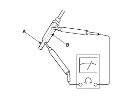Auf Durchgang prüfen zwischen mittlerem Pol (A) und äußerem Pol (B) des Antennenkabels. Es darf kein Durchgang bestehen.