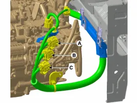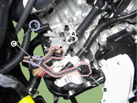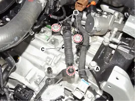 Die in der nachstehenden Abbildung gezeigten Steckverbinder (A, B, C) abziehen. (A) Getriebestellmotor-Steckverbinder (B) Getriebestellantrieb-Magnetventilsteckverbinder (C) Kupplungsstellantrieb-Steckverbinder