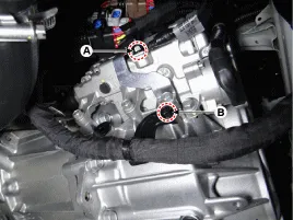 Obere Befestigungsschraube (A) des Getriebes und Befestigungsschraube (B) des Anlassers lösen.