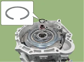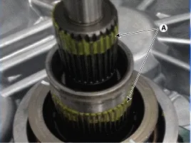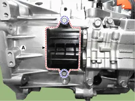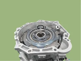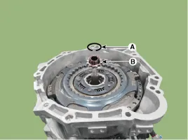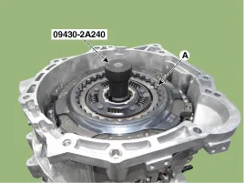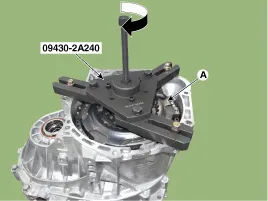 Das Spezialwerkzeug (09430-2A240) auf der Kupplungsgehäuseseite anbringen. Doppelkupplungsgetriebe (A) durch Drehen der Welle des Spezialwerkzeugs.