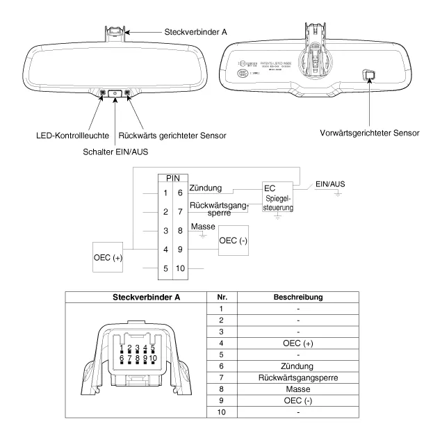 Der elektrochromatische Innenrückspiegel (ECM) dient dazu, das vom nachfolgenden Fahrzeug im Rückspiegel reflektierte Licht abzublenden. Der Sensor im Spiegel erfasst die Helligkeit. Wenn die Scheinwerfer vom nachfolgenden Fahrzeug im Spiegel reflektiert werden, reagiert eine chemische Schicht im Spiegel auf die Helligkeit und verändert die Reflektivität von 10 auf 70%. Beim Einlegen des Rückwärtsgangs wird der Spiegel unabhängig von der Umgebung hell. Das ECM empfängt Signale über Spannung, Masse und Rückwärts und verwendet zwei Sensoren, um Intensität der Blendung zu messen.