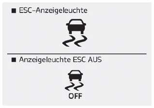 Wenn das ESC-System während einer aktiven Regelphase (ESC-Kontrollleuchte blinkt) abgeschaltet wird, kann das Fahrzeug außer Kontrolle und ins Schleudern geraten.