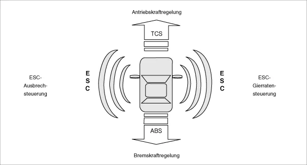 Die Elektronische Stabilitätssteuerung (ESC) erfasst gefährliche Fahrsituationen wie z.B. Panikreaktionen in gefährlichen Situationen und stabilisiert das Fahrzeug durch Abbremsen einzelner Räder und durch Eingriffe in die Steuerung des Motors.