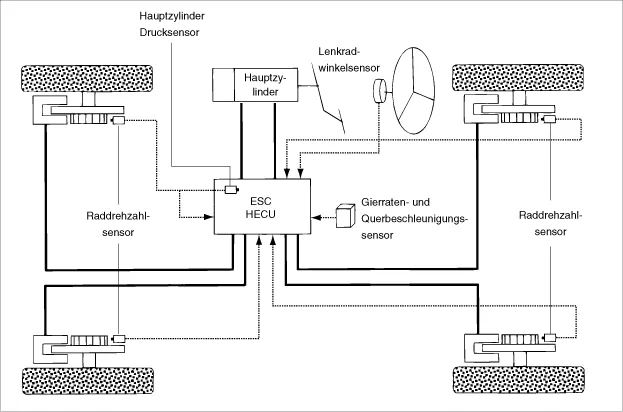 Das ESP besteht im wesentlichen aus drei Baugruppen :den Sensoren, der elektronischen Steuereinheit und denStellmotoren.