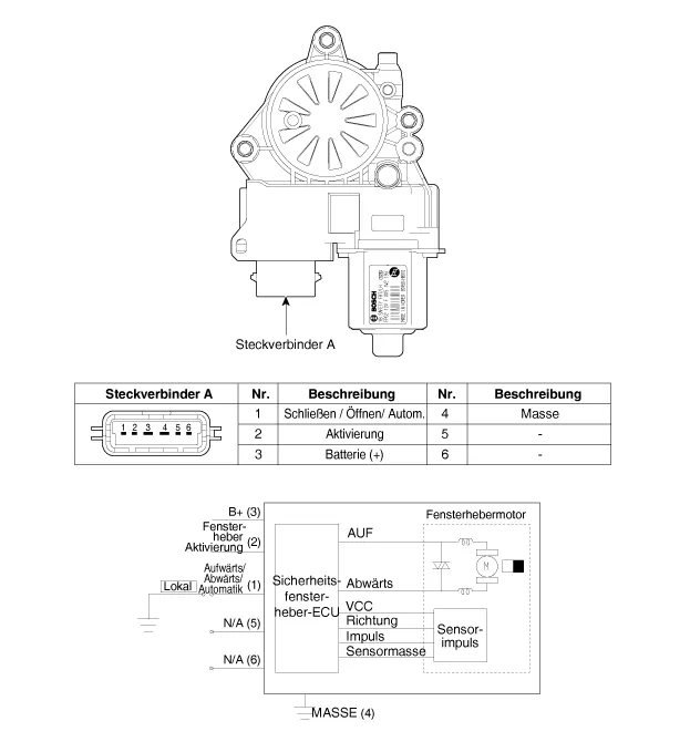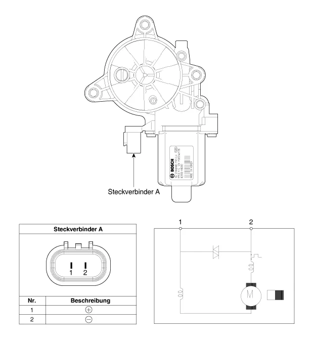 B+ direkt an die Klemmen des Fensterhebermotors anlegen und prüfen, ob der Motor gleichmäßig arbeitet. Danach umpolen und den Motor in entgegengesetzter Richtung auf gleichmäßige Funktion prüfen. Wenn die Funktion nicht ordnungsgemäß ist, Fensterhebermotor ersetzen.
