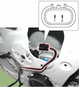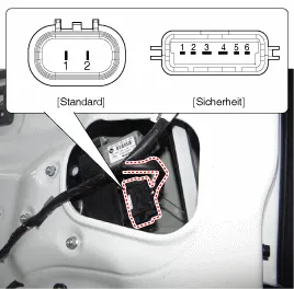 B+ direkt an die Klemmen des Fensterhebermotors anlegen und prüfen, ob der Motor gleichmäßig arbeitet. Danach umpolen und den Motor in entgegengesetzter Richtung auf gleichmäßige Funktion prüfen. Wenn die Funktion nicht ordnungsgemäß ist, Fensterhebermotor ersetzen. [Standard-Fensterhebermotor]