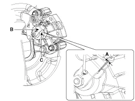 Feststellbremszug durch Anziehen der Einstellmutter befestigen bis die Hebel beider Bremssättel aus der Stopp-Stellung bewegt werden und ein Abstand von (A) zwischen Hebel (B) und Anschlag (C) besteht.