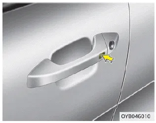 Die Türen können durch diesen Knopfdruck nur entriegelt werden, wenn der Smart-Key max. 0,7~1 m vom Außentürgriff entfernt ist. Wenn Sie sich vergewissern möchten, ob eine Tür verriegelt wurde oder nicht, prüfen Sie die Türverriegelungstaste im Inneren des Fahrzeugs oder ziehen Sie an dem Außentürgriff.