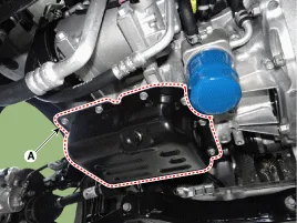 Ölwanne (A) abbauen. Schneide des Spezialwerkzeugs (09215-3C000) zwischen Leiterrahmen und Ölwanne einführen. Die Dichtung durchschneiden und die Ölwanne ausbauen.