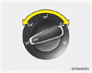 Der Modusschalter steuert die Richtung des Luftstroms im Belüftungssystem. Die Luft kann in den Fußraum, zu den Düsen im Armaturenbrett und zur Windschutzscheibe geleitet werden. Es werden fünf Symbole für die Lüftungsmodi Kopfbereich, Kopfbereich & Fußraum, nur Fußraum, Fußraum & Windschutzscheibe und Windschutzscheibe entfrosten verwendet.