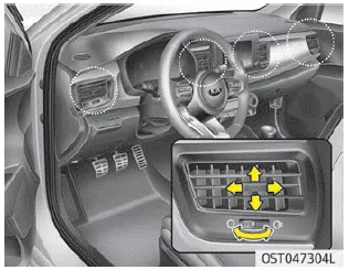 Zusätzlich können Sie an diesen Düsen die Richtung des Luftstroms durch Betätigung des Einstellhebels verändern, siehe Abbildung.