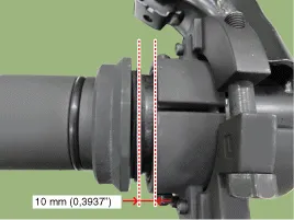 Durch drehen der Hauptschraube (A) im Uhrzeigersinn mit einem Druckluft-Schlagschraube so montieren, dass ein Spalt von 10 mm zwischen Buchse und Endkante der Buchsenführung besteht. Bei diesem Vorgang per Sicht durch die Bohrung der Kappe (B) prüfen, ob sich die Mutter löst. Sollte sich die Mutter lösen, diese mit dem vorgegebenen Drehmoment nachziehen.