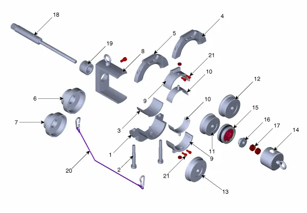 In der Reihenfolge Ausbauadapter A (A), Lager (B) und Unterlegscheibe (C) an der Hauptschraube anbringen.