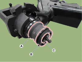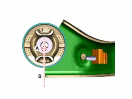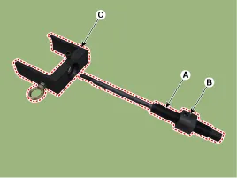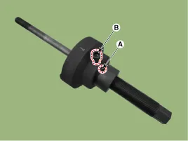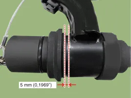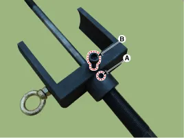 Durch drehen der Hauptschraube (A) im Uhrzeigersinn mit einem Schlagschraube so montieren, dass ein Spalt von 5 mm zwischen Buchse und Drehstabachse besteht. Bei diesem Vorgang per Sicht durch die Bohrung der Kappe (B) prüfen, ob sich die Mutter löst. Sollte sich die Mutter lösen, diese mit dem vorgegebenen Drehmoment nachziehen.