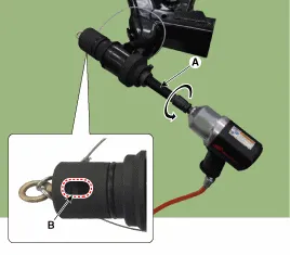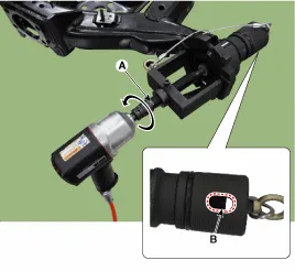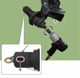 Die Buchse durch Drehen der Hauptschraube (A) entgegen dem Uhrzeigersinn mit einem Schlagschrauber entfernen. Bei diesem Vorgang per Sicht durch die Bohrung der Kappe (B) prüfen, ob sich die Mutter löst. Sollte sich die Mutter lösen, diese mit dem vorgegebenen Drehmoment nachziehen.
