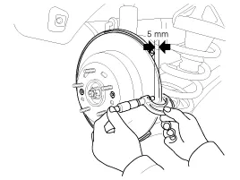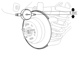 Ein Lehre mit Anzeige ca. 5mm (0,2 in.) von der äußeren Umfang der Bremsscheibe ansetzen und den Rundlauf der Scheibe messen.