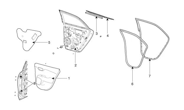 6. Dichtungsprofil am Hintertürrahmen 7. Hintertürdichtungsleiste 8. Hintertürscharnier |
