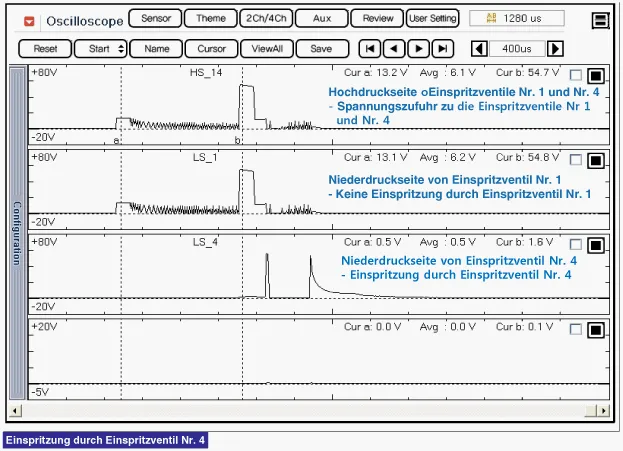 Die drei folgenden Wellenformen wurden von den Einspritzventilen Nr. 1 und Nr. 4 genommen. Die obere Wellenform stammt von der High-Seite (Zufuhrseite) der Einspritzventile Nr. 1 und Nr. 4, die mittlere Wellenform stammt von der Low-Seite (Masseseite) des Einspritzventils Nr. 1 und die untere Wellenform stammt von der Low-Seite des Einspritzventils Nr. 4.