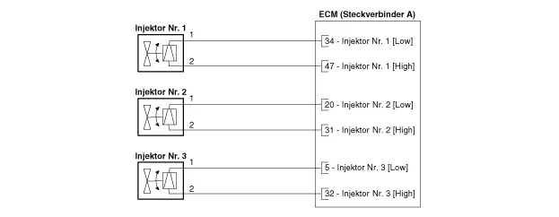 Das GDI-Einspritzventil entspricht im Wesentlichen einem normalen Einspritzventil, spritzt den Kraftstoff aber mit einem wesentlich höheren Druck direkt in den Brennraum und ist mit einer Drallscheibe ausgestattet, die dem Kraftstoff beim Austritt aus der Düse einen Drall versetzt. Dadurch kann der Kraftstoff feiner zerstäubt werden. Das ECM steuert sowohl die Zufuhrkreise (Hoch-Seite) zum Anlegen der Spannung an die Einspritzventile als auch die Massekreise (Niedrig-Seite) zum Aktivieren der Einspritzventile. Die Zufuhr für je 2 Einspritzventile erfolgt durch denselben Treibersatz. Da die Zündspulen mit den Zylindern gepaart sind (1-4 und 2-3), sind auch die Einspritzventile als Paare ausgelegt.