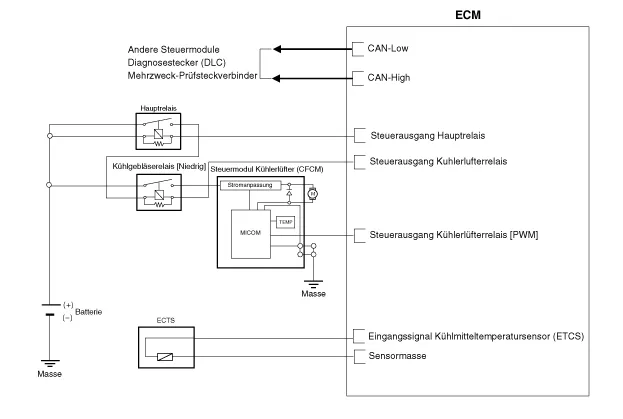 Der Kühlerlüfter arbeitet in 2 Stufen (HIGH/LOW). Das Motorsteuermodul (ECM) steuert den Kühlerlüfter entsprechend Kühlmitteltemperatur, Fahrzeuggeschwindigkeit und Betrieb der Klimaanlage.