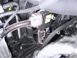 Reparaturverfahren Ein- und Ausbau. 1. Ausgleichsbehälterschlauch (A) sowie den Turboladerwasserleitungsschlauch (B) entfernen.