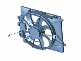 Steckverbinder (A) des Kühllüftermotors abziehen und dann die Verkleidungsabdeckung (B) abnehmen.