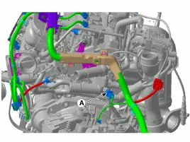 Steckverbinder (A) des Kühlmitteltemperatursensors abziehen und Kabelsteckverbinder sowie Kabelbaumschellen entfernen. Dann die Steckverbinderhalterungen um die Kühlmitteltemperatureinheit herum entfernen.