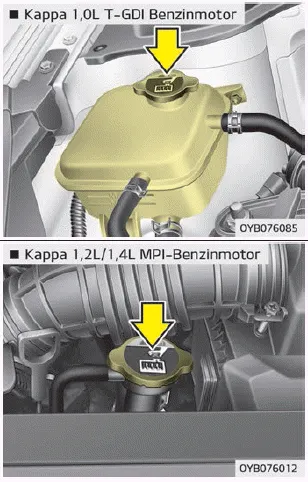 Lassen Sie das Kühlmittel von einer Fachwerkstatt austauschen. Kia empfiehlt den Besuch eines Kia-Händlers/ Servicepartners. ACHTUNG Legen Sie vor dem Auffüllen des Motorkühlmittels ein dickes Tuch um den Kühlerverschlussdeckel, um zu vermeiden, dass Kühlmittel auf Motorteile, z.