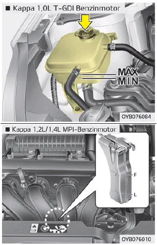 Das Kühlmittel sollte zwischen den Markierungen MAX und MIN (F und L) an der Seite des Kühlmittelbehälters stehen, wenn der Motor kalt ist. Wenn der Kühlmittelstand zu niedrig ist, füllen Sie ausreichend destilliertes (deionisiertes) Wasser auf. Bringen Sie den Kühlmittelstand auf MAX (F), füllen Sie jedoch nicht zu viel Kühlmittel ein. Wenn häufig Öl nachgefüllt werden muss, lassen Sie die Anlage von einer Fachwerkstatt überprüfen. Kia empfiehlt den Besuch eines Kia-Vertragshändlers/ Servicepartners.