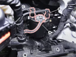 Steckverbinder vom Schnellverschluss am Tankeinfüllschlauch (B) und am Auslassschlauch (C) abziehen.