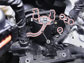 Den Kraftstofffilter (B) nach Lösen der Befestigungsschrauben (A) entfernen.