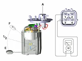 Mit einem Ohmmeter den Widerstand zwischen den Klemmen 1 und 3 des Gebersteckers (A) bei den einzelnen Schwimmerständen messen.