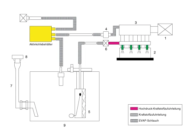 Das System verhindert, dass Kraftstoffdämpfe aus dem Kraftstofftank in die Atmosphäre gelangen. Wenn der Kraftstoff in dem Kraftstofftank verdampft, strömt der Dampf durch Entlüftungsschläuche oder -rohre in einen Behälter, der mit Aktivkohle gefüllt ist, und der Behälter hält den Dampf vorübergehend in der Aktivkohle.