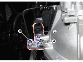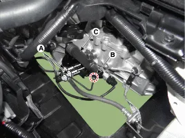 Schrauben (A) und Mutter (B) entfernen, dann Ausrückzylindereinheit (C) ausbauen.