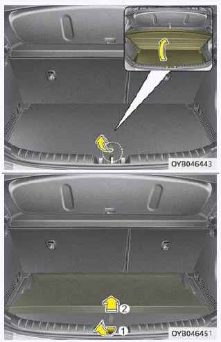 In diesem Staufach können Sie Verbandkasten, Warndreieck, Werkzeuge usw. unterbringen – Dinge, die Sie bei Bedarf schnell brauchen. 1. Erfassen Sie den Griff oben an der Abdeckung und heben Sie die Abdeckung damit an.