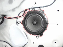 Steckverbinder (A) abziehen und Schrauben lösen, dann hinteren Türlautsprecher (B) entfernen.