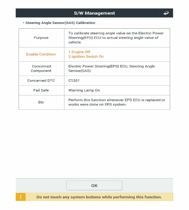Die Zündung einschalten und dann vor dem Starten des Motors min. 10 Sekunden warten. Anschließend sicherstellen, dass die MDPS korrekt funktioniert. |