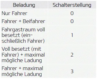 In der folgenden Tabelle sind Beispiele für ordnungsgemäße Schalterstellungen aufgeführt. Für Beladungszustände, die hier nicht aufgeführt sind, drehen Sie das Stellrad in eine Stellung, die einem aufgeführten Beispiel am nächsten kommt.