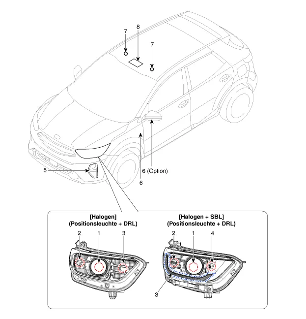 5. Nebelscheinwerfer 6 . Blinkleuchte (Türspiegel / Seite) 7 . Kosmetikleuchte 8 . Kartenleseleuchte |